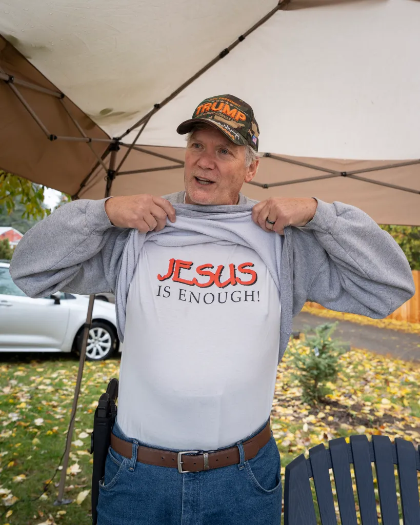 Her opponent, Brodhead, was recruited by the KCRCC, and easily won its support. On Election Day, he stood under a tent near the Hauser Lake Fire Station, a polling location, with a handgun peeking out from his waistband and a T-shirt proclaiming “Jesus is Enough!” that he showed off by lifting up his gray sweatshirt.