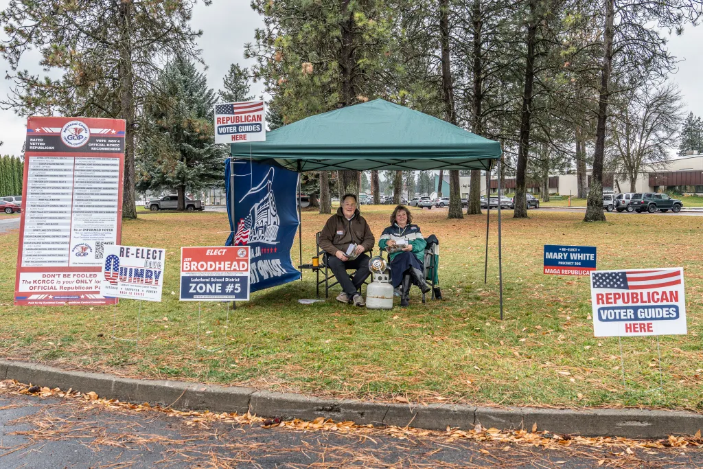 Mary White, a precinct member of North Idaho’s Kootenai County Republican Central Committee, sits at right under a tent outside Lakeland High School, a polling location, on Election Day. -