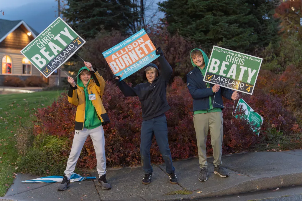 Carter Knoll, Roy Gallus and Bentley Knoll hold signs for Lakeland school board candidates Chris Beaty and Allison Burnett in a supermarket parking lot in Rathdrum, Idaho, the evening before Election Day. (Carter and Bentley are the sons of Allison Knoll, a former Lakeland drama teacher who quit last spring; Roy is Suzanne Gallus’ youngest child).