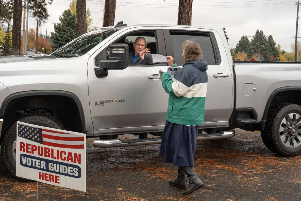 Mary White, whose sign identifies her as a “MAGA REPUBLICAN” and precinct member of the Kootenai County Republican Central Committee, hands a voter a list of the KCRCC-endorsed candidates. -