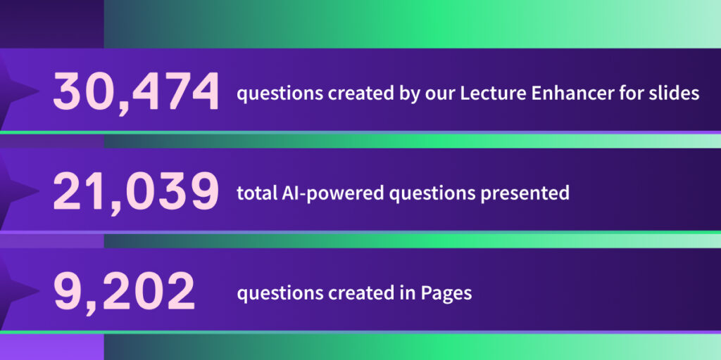 Now, let’s turn to you. More than 1,500 of your fellow faculty members used Ace this past year. Educators especially valued being able to add AI-generated questions into their slides using our Lecture Enhancer feature. Not only do our AI-powered features for educators save time during the question creation stage, Ace generates hints and explanations that allow students to identify their own misconceptions. Even better, we’ve charted a 182 percent increase in Ace usage among professors since our 2023 summary—speaking to the benefit of incorporating AI into the classroom.