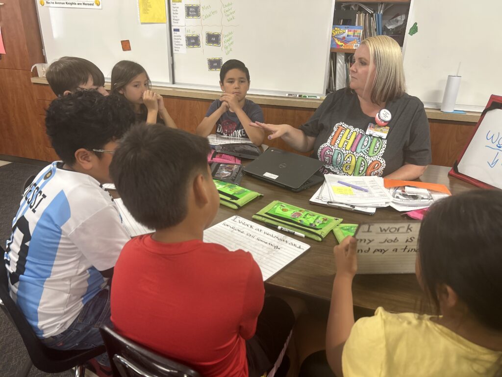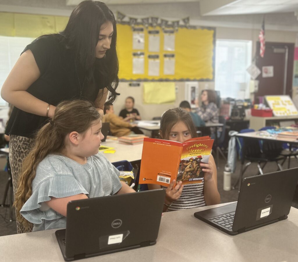 Twenty-three-year-old Valerie Caballero worked with seven third graders, guiding numerous activities on decoding words, on Thursday at Roche Elementary in Portersville. With a group of three students, teacher Shelly Noble focused on building reading comprehension. The rest of the class, also in small groups, read independently or completed literacy assignments online, until it was time for the groups to change stations — to go to Caballero or Noble.