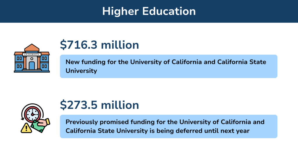 - UC would get $350.6 million in new funding and CSU would receive $365.7 million, keeping with Newsom’s 2022 pledge to give annual budget increases for five years.