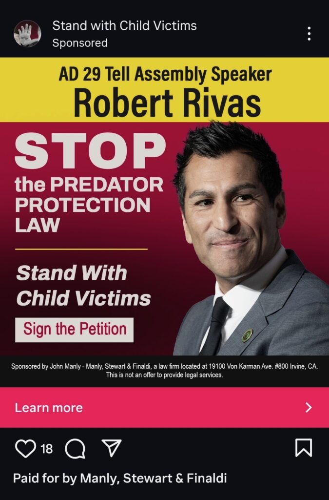 An Irvine law firm, Manly, Stewart & Finaldi, one of the country’s top firms representing sexual abuse victims, ran two online ads about the bill earlier this month, targeting Assembly Speaker Robert Rivas, D-Hollister.
