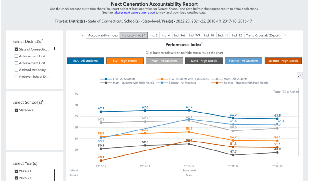 By contrast, one of seven states to receive an A, Connecticut shows five years of results in bar charts and line graphs for 11 measures.