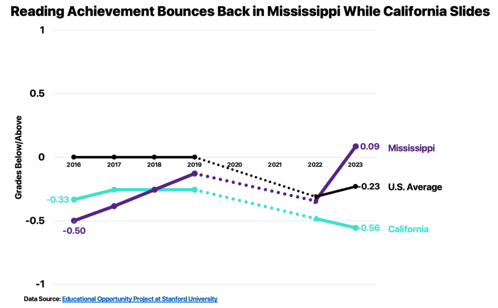 Yet, when it comes to teaching children to read, Mississippi is a bright spot, one of three states whose gains in reading achievement put their schools ahead of where they were before the pandemic. California is one of ten states where reading scores continue to fall.