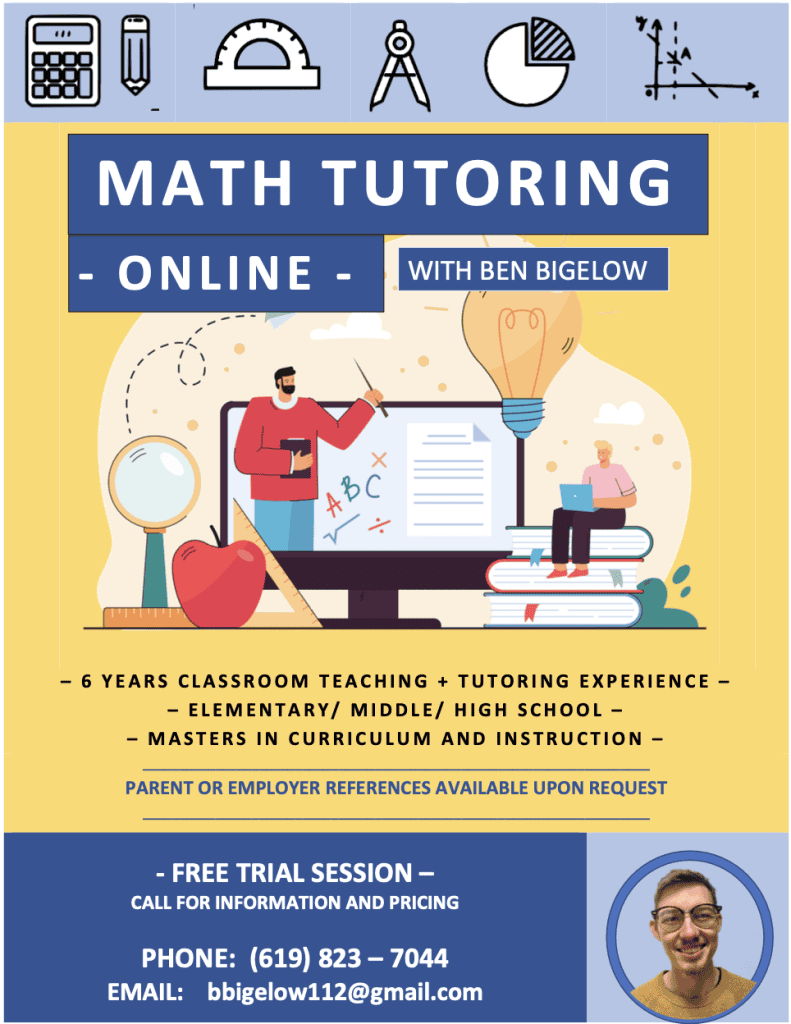 Ben is an incredibly patient and supportive teacher, who has a gift for making students feel better about math and/or accelerating their math ability. If your child needs some help, Ben is offering a first session for free. You can reach him at (619) 823-7044 or [email protected].