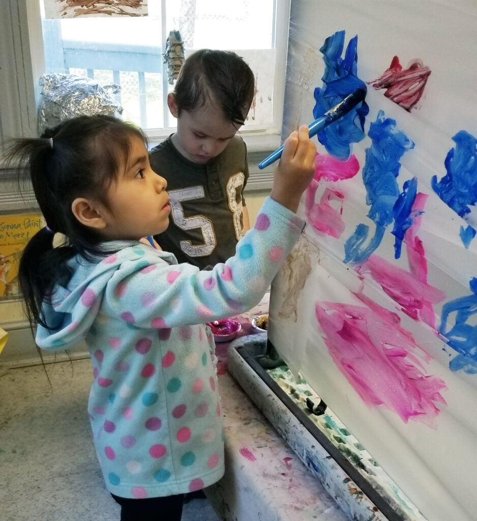 Preschool children learn to express themselves through painting.