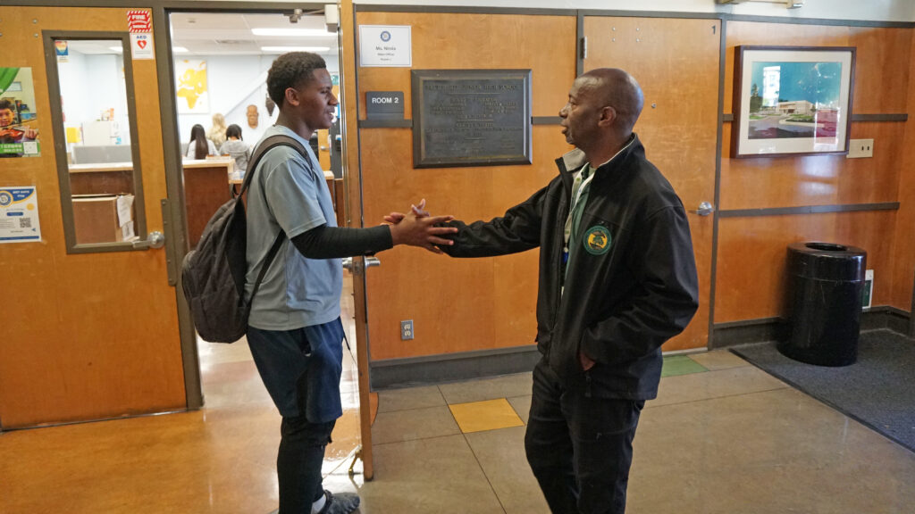 Eddie Franklin, the culture and climate ambassador for Oakland Unified, stops a student while they are walking to class and asks how their day is going.