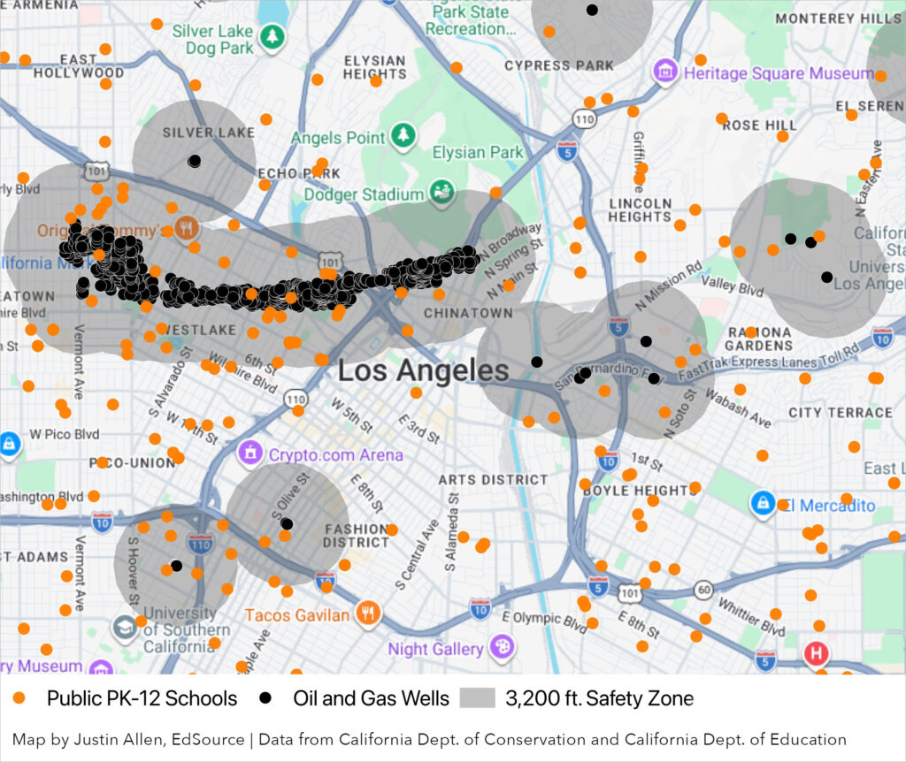 A concentration of schools near oil wells in the Los Angeles basin
