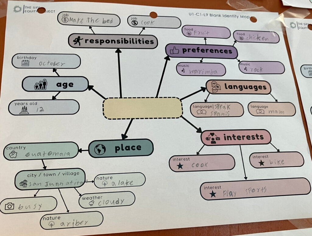 The class began the school year with a unit on identity. Studens learned how to say their names, how old they are, where they are from, what language they speak. They later put together “identity maps” with their name in the middle, and information about their hometowns, their ages, their responsibilities, families and what they like to eat and do for fun written in spokes all around. Then they created slideshows with the information and added photos.