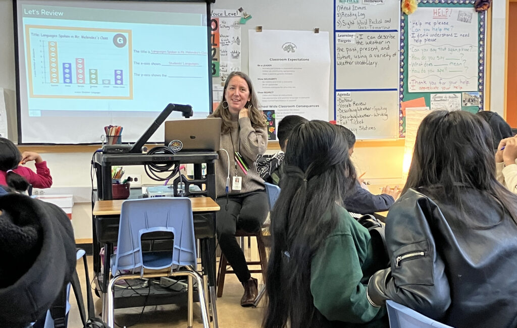 On one recent morning in her English class, Maribel and her peers were analyzing graphs showing favorite colors, favorite foods, favorite sports and home languages among students in a class. They were practicing marking the x-axis and y-axis, pronouncing numbers in English and talking about what the graphs meant.