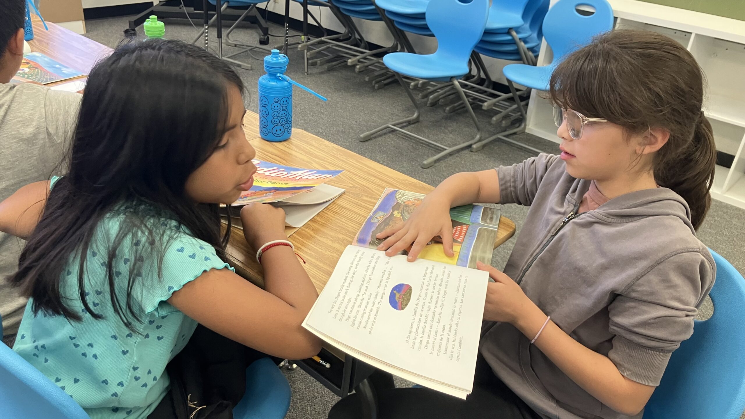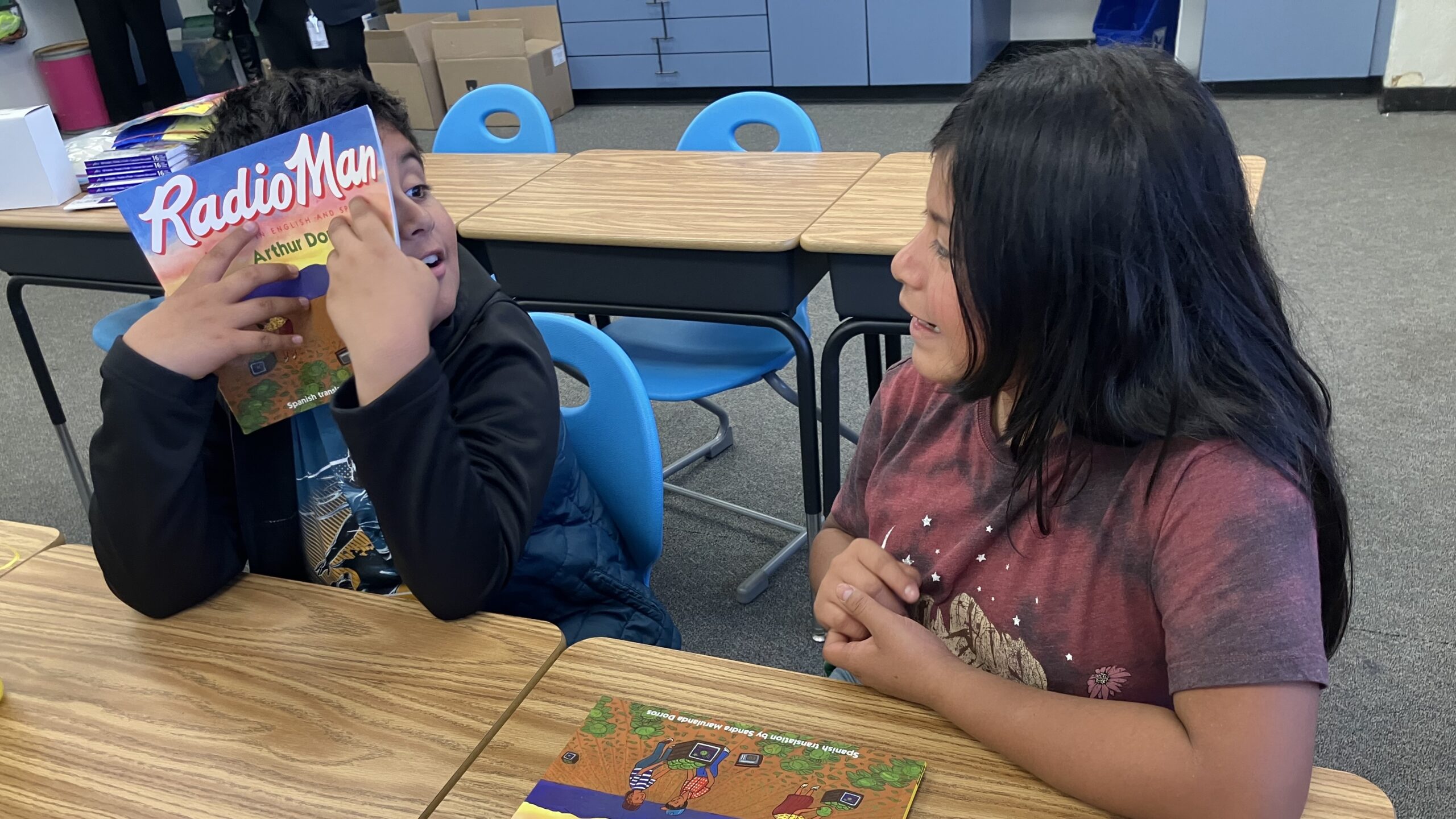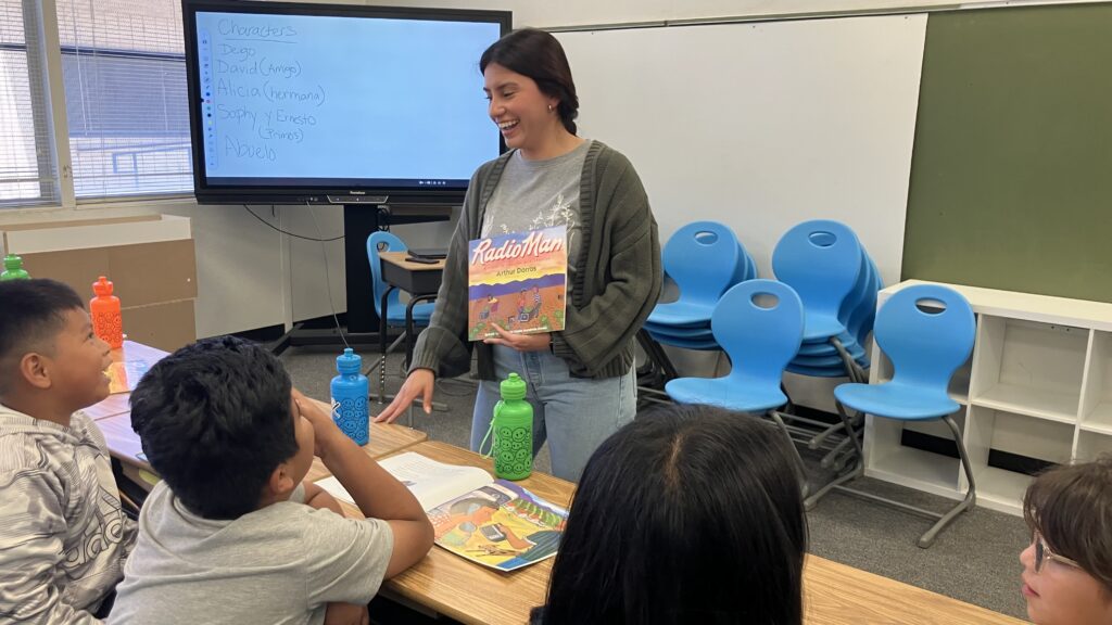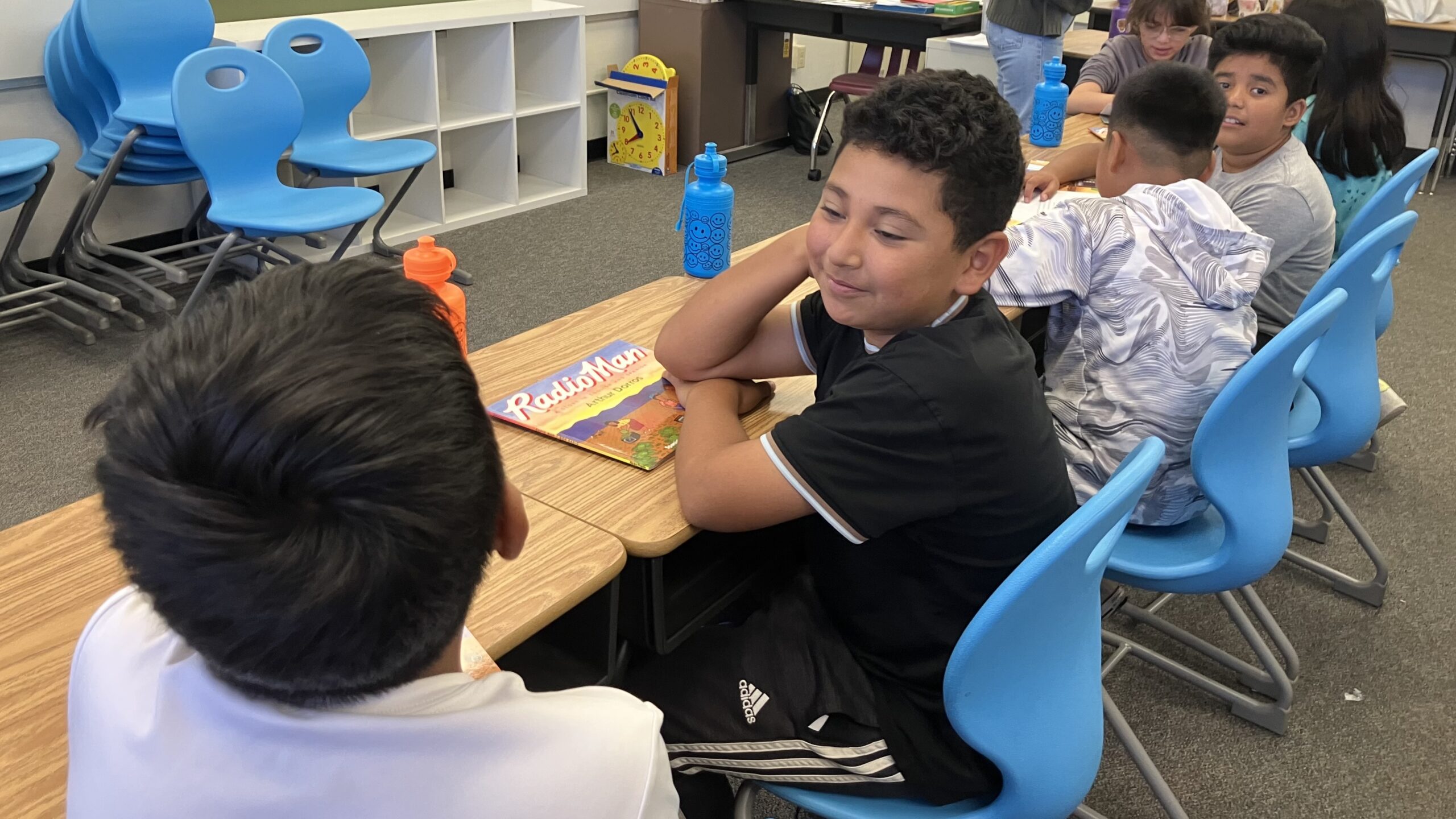 Fifth graders discussed a book they were reading, “Radio Man,” about a child in a migrant farm-working family. Teacher Keyla Robles asked them to talk with their classmates about what happened at the beginning of the book, and then what happened in the middle.