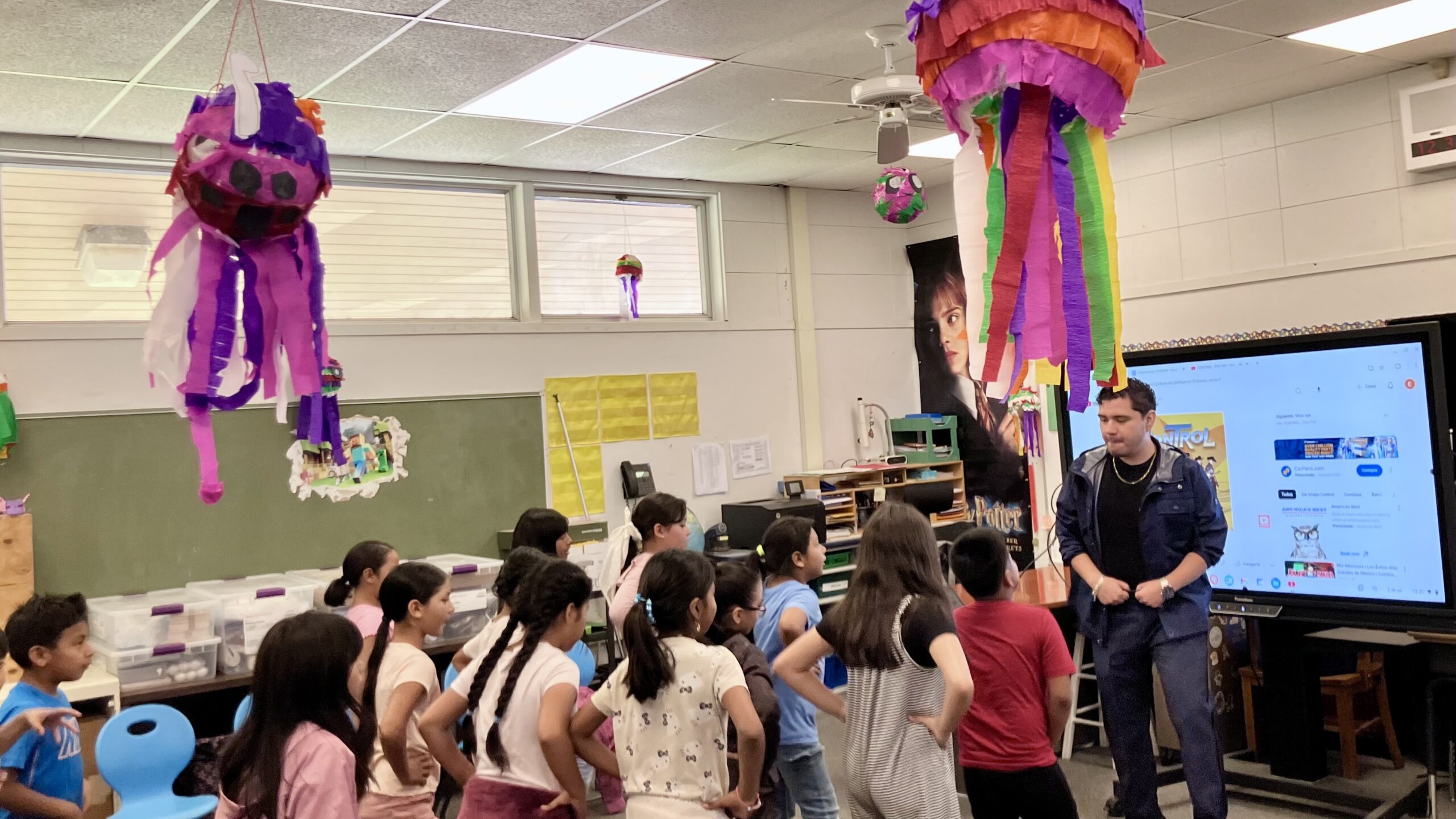 In another classroom, third and fourth graders practiced the moves for a dance they learned from a visiting teacher from Mexico. Piñatas the students made by hand hung from the ceiling.