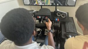 Fresno Unified students Urai Wheatley and Matthew Molina use a flight simulator during aviation camp, which includes gaining experience flying small aircraft and taking field trips to military bases and museums.