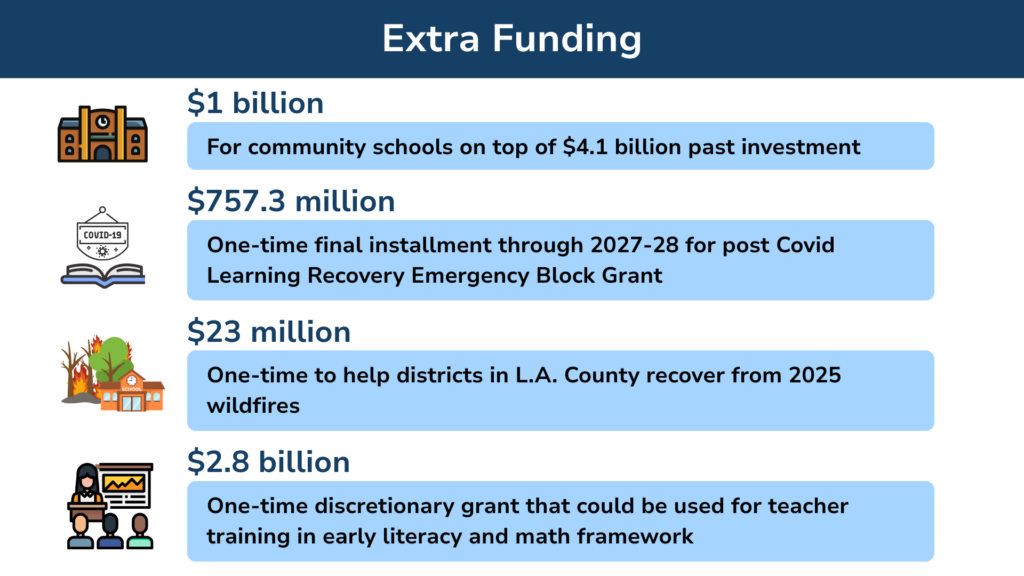 - Budget proposal includes extending and increasing funding for the 2,500 existing community schools, teacher residencies, and multibillion dollar post-Covid learning recovery funding through 2027-28.