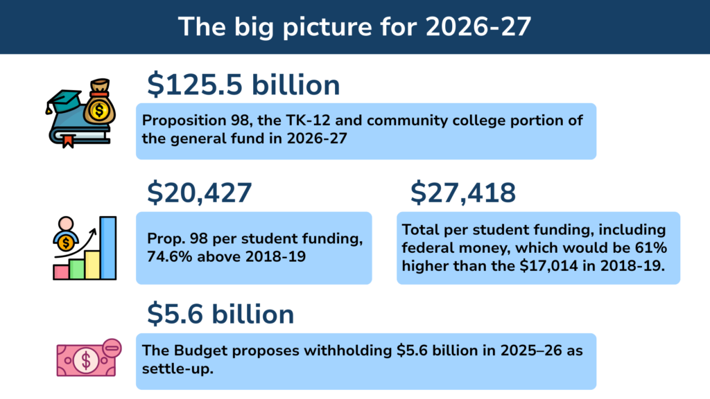 This will raise state funding per student under Proposition 98 to a record $20,427 in 2026-27, according to the budget summary. Prop. 98 requires that about 40% of the general fund be allocated to schools and community colleges.
