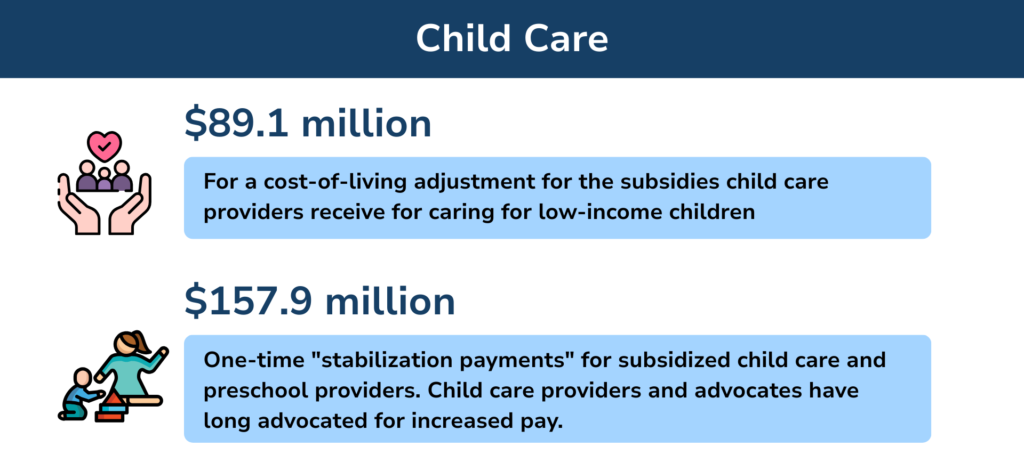 However, his proposal includes an increase of $89.1 million for a cost-of-living adjustment for the subsidies child care providers receive for caring for low-income children, and $157.9 million for one-time “stabilization payments” for subsidized child care and preschool providers. Child care providers have long advocated for increases.