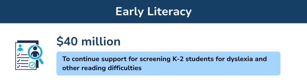 - $40 million is earmarked to continue screening all students in kindergarten, first and second grades to identify students at risk of reading difficulties.