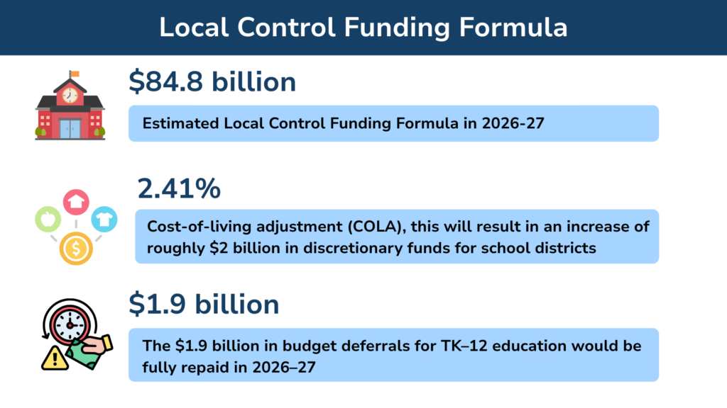 About $2 billion from a 2.4% cost-of-living adjustment, or COLA, for the Local Control Funding Formula will be a point of contention. The California School Boards Association has made a COLA-plus increase its primary aim for 2026-27, since districts’ expenses will far exceed the minimum COLA that is based on a national formula for costs of goods and services. Many districts face rising health insurance costs for employees, demands for higher pay and reduced funding due to declining enrollments.