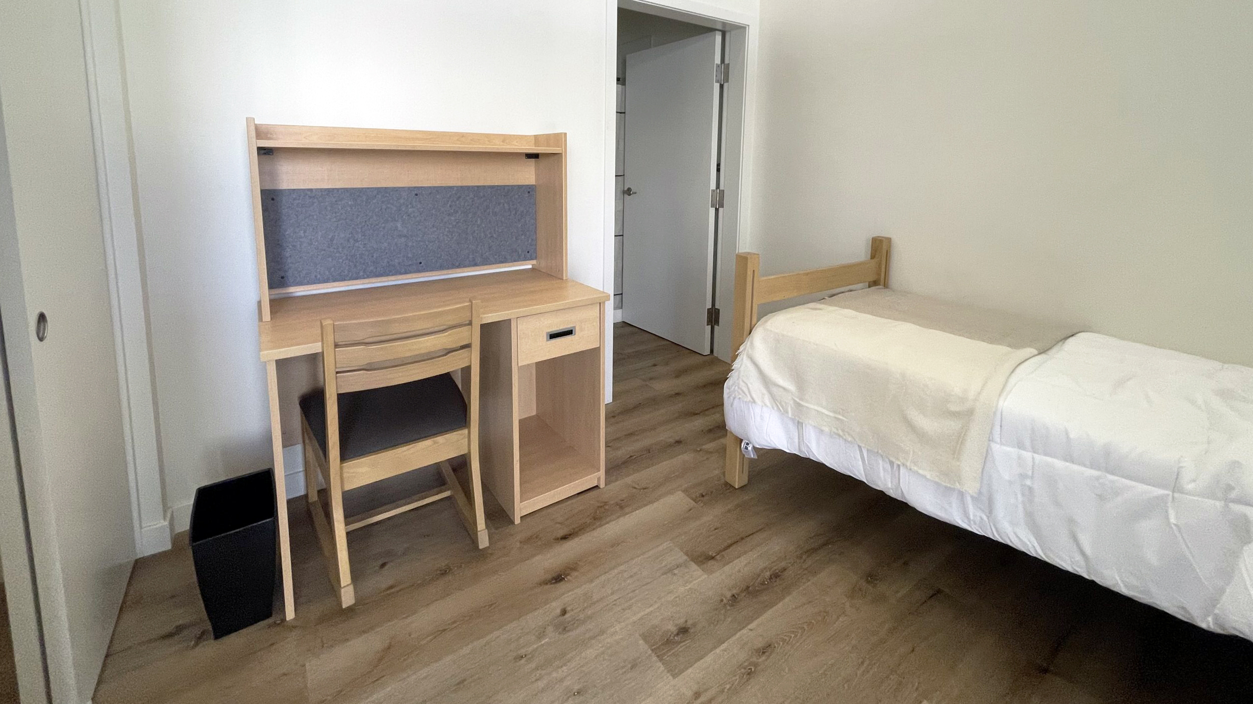 The beds, for example, were purchased from a vendor that manufactures the extra-long twin beds typically found in dorm rooms. There is a communal kitchen that includes a fridge where, just as in a dorm, a meal might be eaten by someone other than the person it belongs to.