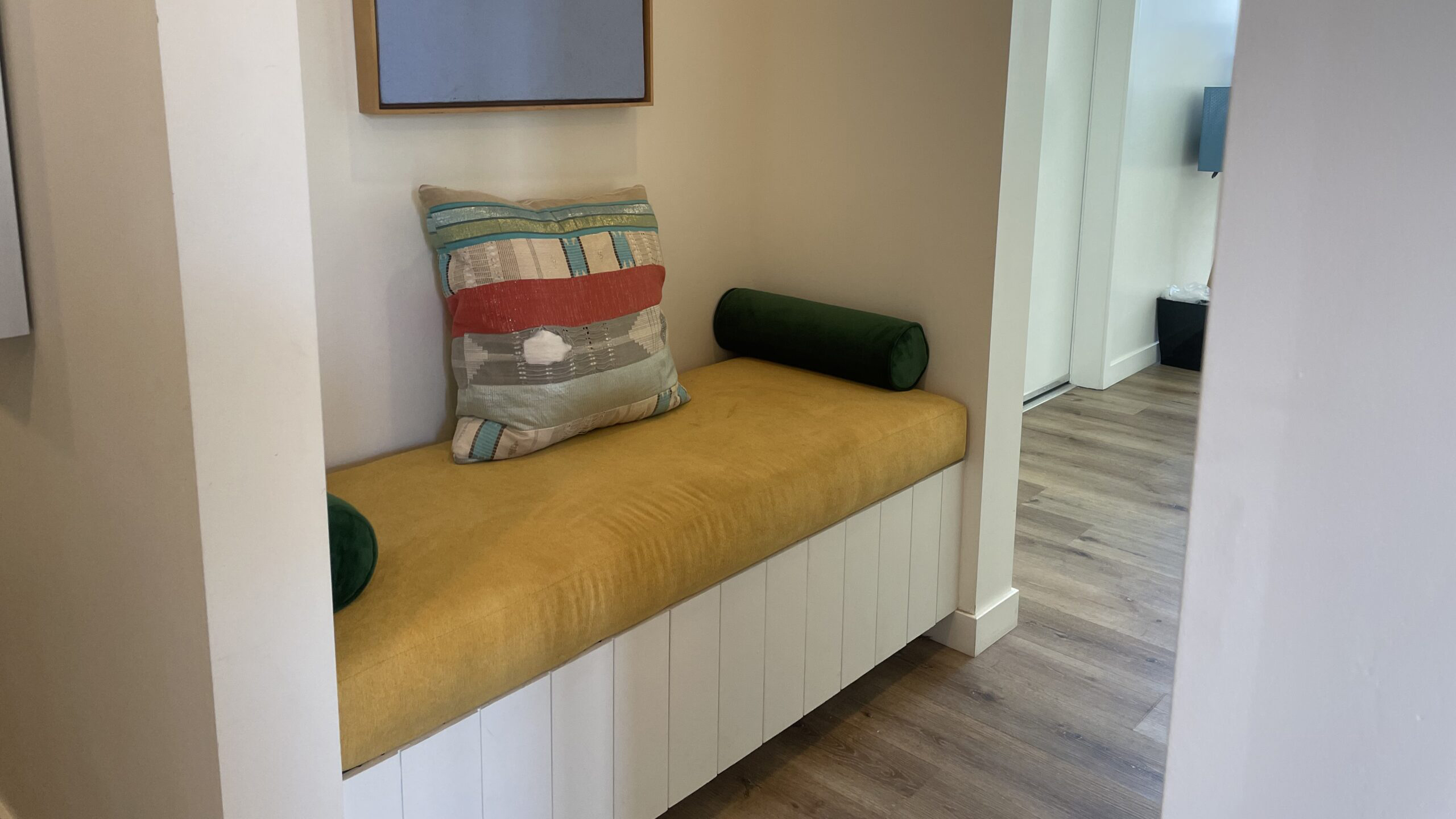 The home features walls painted in warm hues, ambient lighting, modern furniture and cushioned cozy seating nooks.