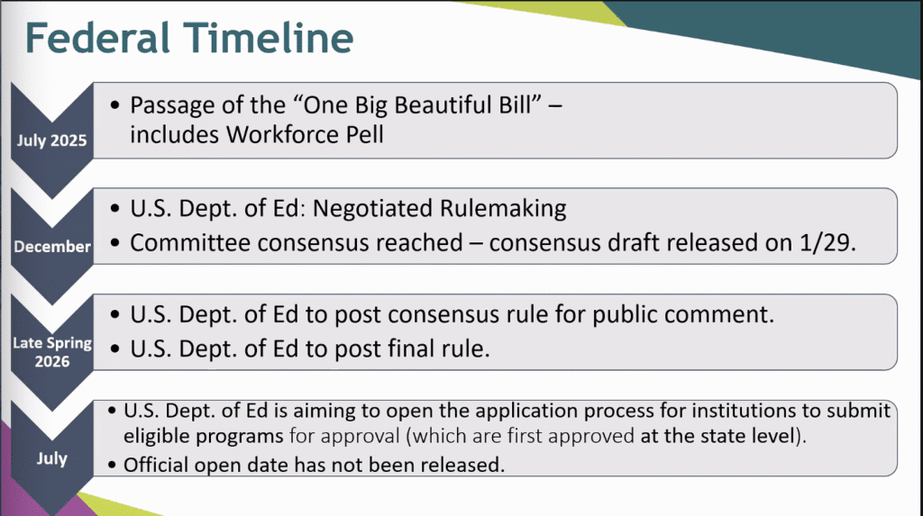 DeSantis then outlined the federal timeline for Workforce Pell, noting that she participated as an alternate negotiator during DOE’ negotiated rulemaking process in December. DOE’s goal is to have a final rule by the spring, and according to statute, the program should launch on July 1.