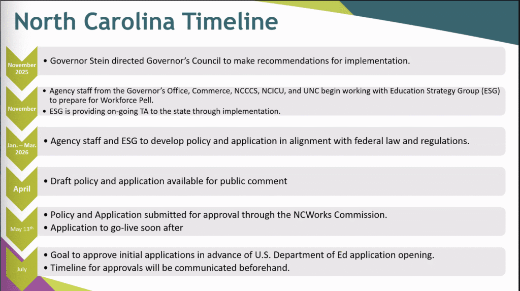 In April, the state hopes to have a draft policy and application for Workforce Pell that would be available for public comment. On May 13, the NCWorks Commission, the state’s workforce development board, would review the policy and application.
