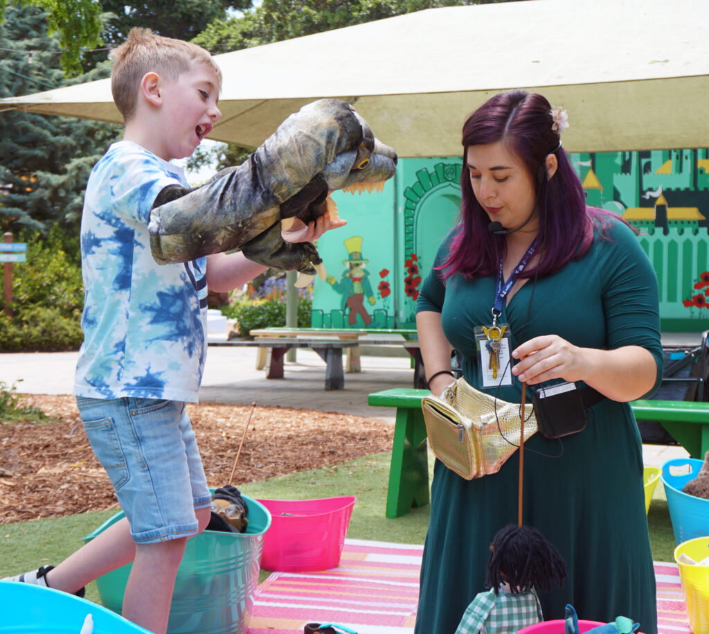 Coming out of the pandemic, Fairyland held focus groups with local teachers to pinpoint what kinds of activities would be most beneficial for the preschool cohort, and the takeaway was that children today need more social-emotional learning as well as more exposure to the creative impulse. Enter puppets.