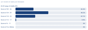 Below is an example of what you will find for an individual school. At the top of each graph, you’ll see the middle range of SAT test scores in math and “evidence-based reading and writing” (EBRW) and the 50% range for ACT scores. I didn’t include it, but there are also charts for ACT’s math and reading scores.