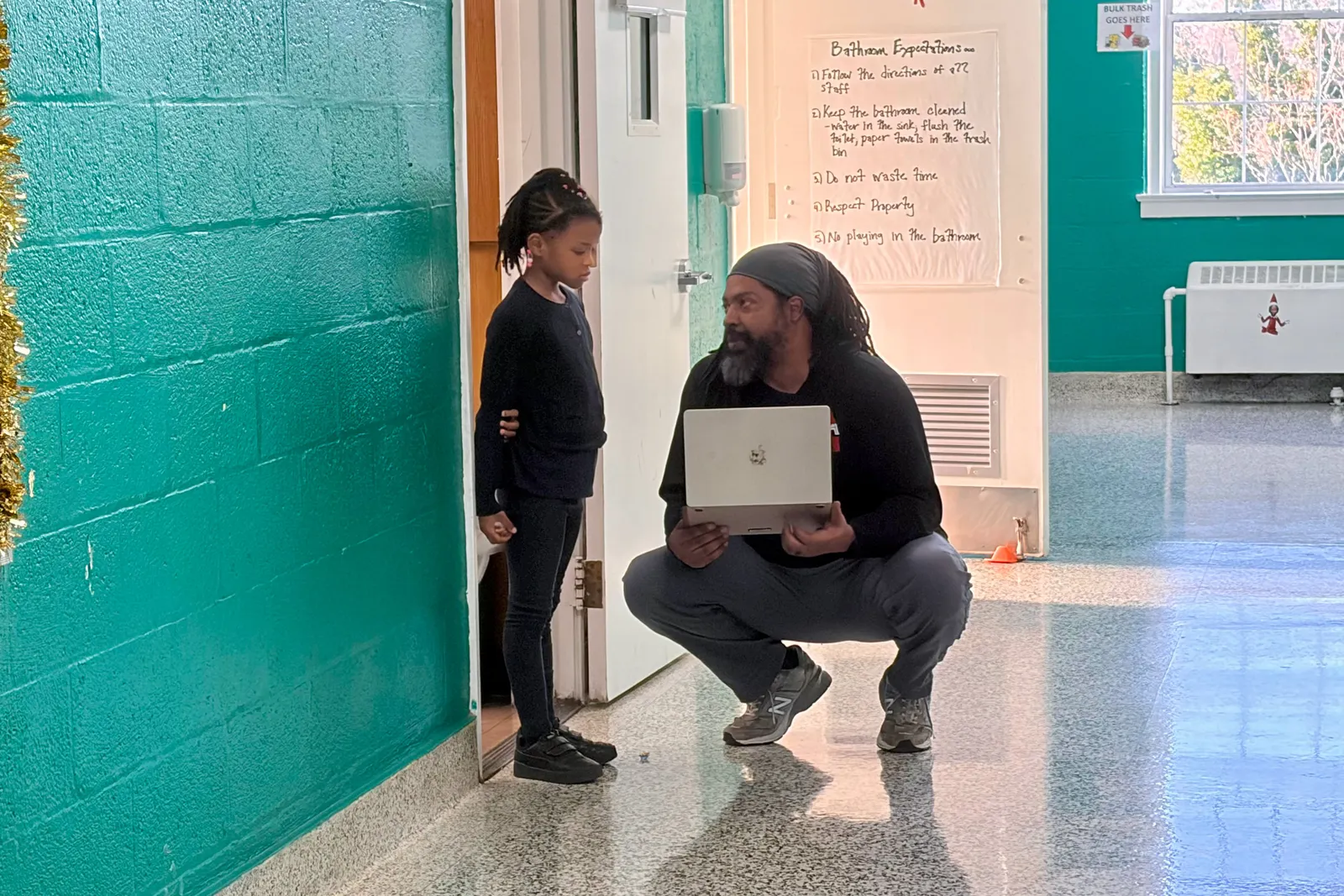 Sean Crowe, a math teacher at Center City Public Charter Schools’ Congress Heights campus in Washington, D.C., reviews a 2nd grader’s work in a school hallway on Jan. 22, 2026.