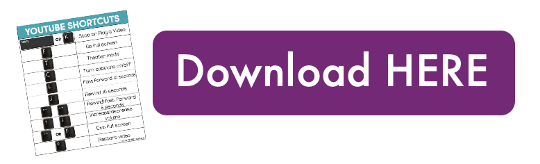 Therefore, I whipped up a quick reference sheet that covers 10 YouTube keyboard shortcuts every teacher needs to know. Many more exist but these 10 shortcuts are typically the most used in the classroom. I have included a mini version as well as a 8.5×11 printout. Now YOU can impress your students 😉.