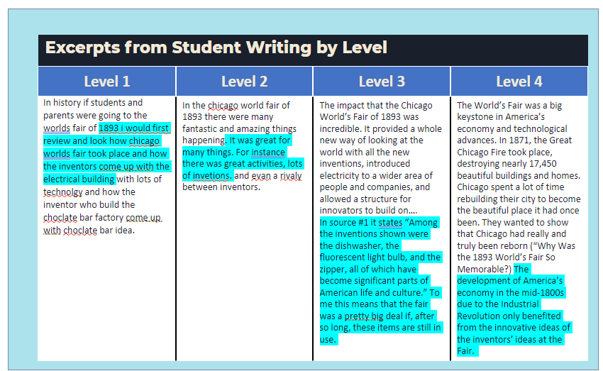 As an example, a sixth-grade writing prompt asks students to research and explain the impact of the 1893 World’s Fair, and different levels of performance show different levels of sophistication, from communicating a few facts to elaborating on how the activities of the fair led to other human accomplishments with long-term impact: