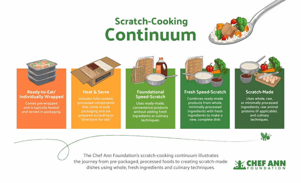 The Chef Ann Foundation “sees the transition to scratch cooking as a continuum of gradual progress rather than an all-or-nothing approach,” according to its website, with a five-step continuum that ranges from ready-to-eat meals to scratch-made meals.